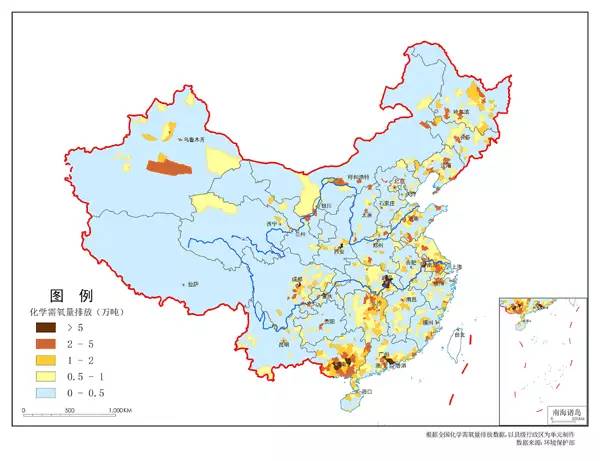 “化學需氧量(COD)”是一種評價水體污染程度的綜合性指標,是指利用化學氧化劑(如重鉻酸鉀)將水中的還原性物質(zhì)(如有機物)氧化分解所消耗的氧量。中國化學需氧量排放分布與二氧化硫排放分布類似,主要分布在比較發(fā)達的城市及工業(yè)化程度較高的城市群群。