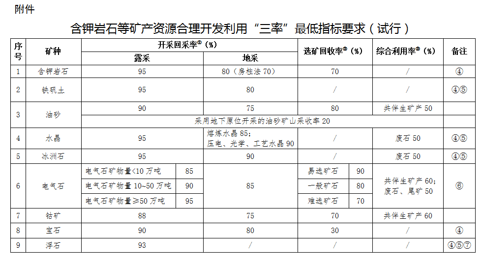 為強化含鉀巖石等礦產(chǎn)資源合理開發(fā)利用的監(jiān)督管理,促進礦山企業(yè)節(jié)約與綜合利用礦產(chǎn)資源,依據(jù)《中華人民共和國礦產(chǎn)資源法》等法律法規(guī),制定含鉀巖石等礦產(chǎn)資源合理開發(fā)利用“三率”最低指標要求(試行),現(xiàn)予以公告。
