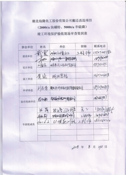2018年8 月24 日,湖北仙隆化工有限公司(建設(shè)單位)成立驗(yàn)收組(驗(yàn)收組名單附后), 對2000t/a 炔螨特、5000t/a 辛硫磷搬遷改改造項目竣工環(huán)境保護(hù)情況進(jìn)行驗(yàn)收檢查。參加驗(yàn)收的有宜昌鼎順檢測有限公司(驗(yàn)收監(jiān)測單位)、湖北天亮環(huán)?萍奸_發(fā)有限公司(環(huán)評單位),會議邀請了3位專家參加驗(yàn)收組的驗(yàn)收檢查工作。